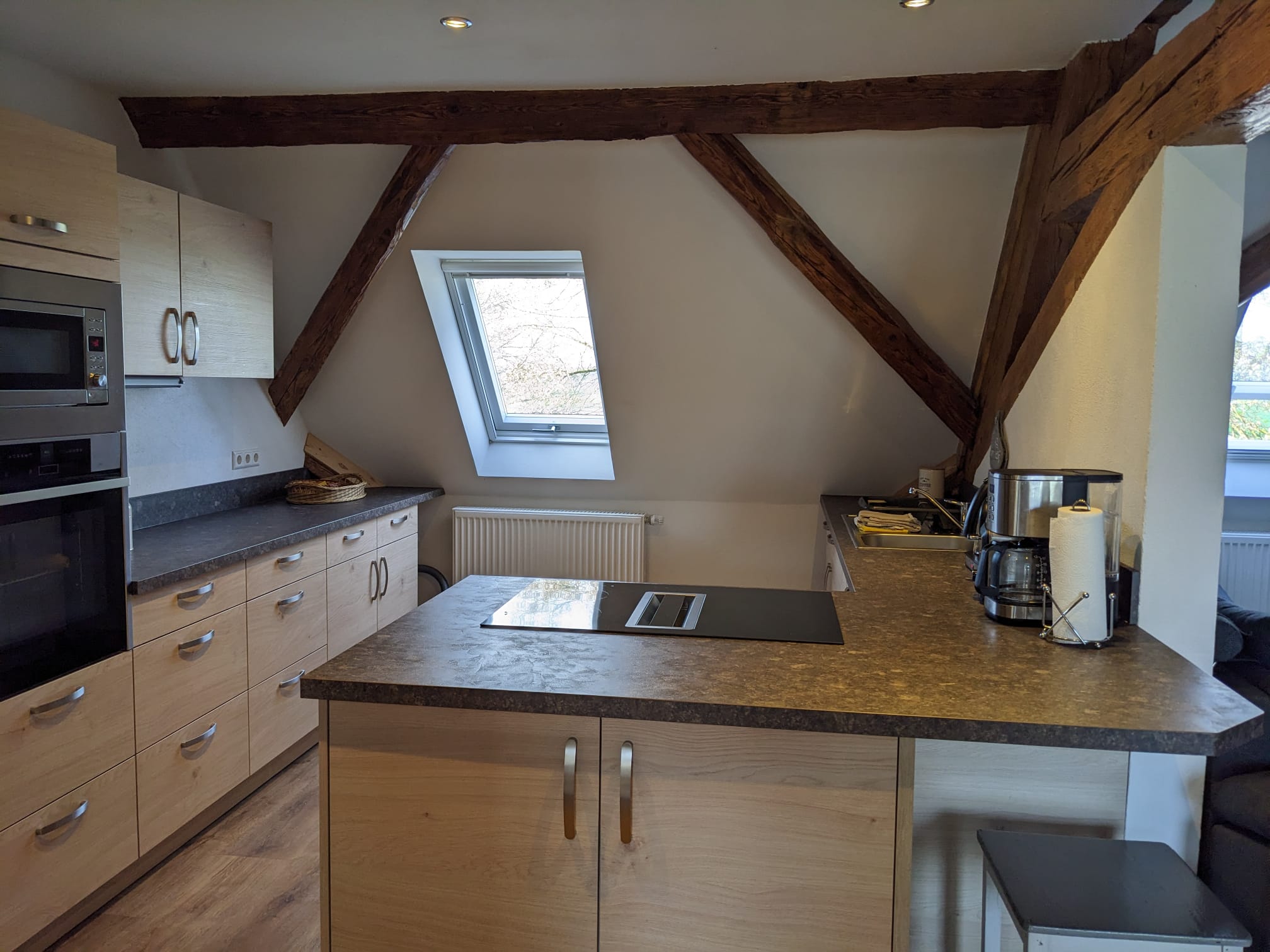 - Küchenzeile mit 4 Plattenherd, Backofen, Spülmaschine, Kühlschrank mit Gefrierfach, Kaffeemaschine, Wasserkocher, Toaster und ausreichend Geschirr